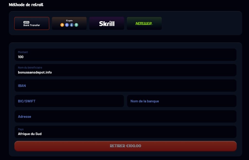 Néanmoins, certains points méritent attention. Le montant minimum de dépôt reste standard (20 €), tandis que le seuil de retrait, lui, démarre à 100 €, ce qui peut être contraignant pour les petits joueurs. À cela s’ajoute une limite hebdomadaire relativement basse (2 000 €). Ces plafonds rendent donc l’expérience moins fluide pour les joueurs réguliers ou ceux qui misent modestement.