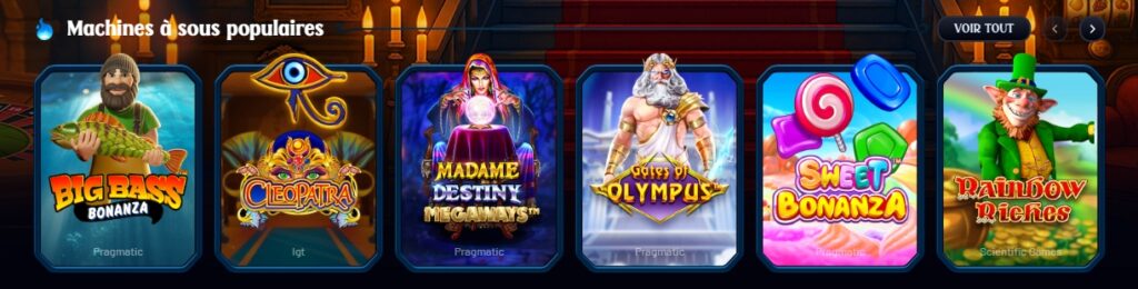 Impossible de passer à côté du catalogue impressionnant de machines à sous. Du classique fruité aux titres récents très animés, tout y est : Big Bass Bonanza, Book of Dead ou encore Sweet Bonanza attirent aussi bien les nostalgiques que les chasseurs de nouveautés. L’ajout régulier de nouveaux éditeurs garantit une expérience toujours renouvelée, tandis que les fonctionnalités innovantes séduisent les amateurs de sensations fortes.