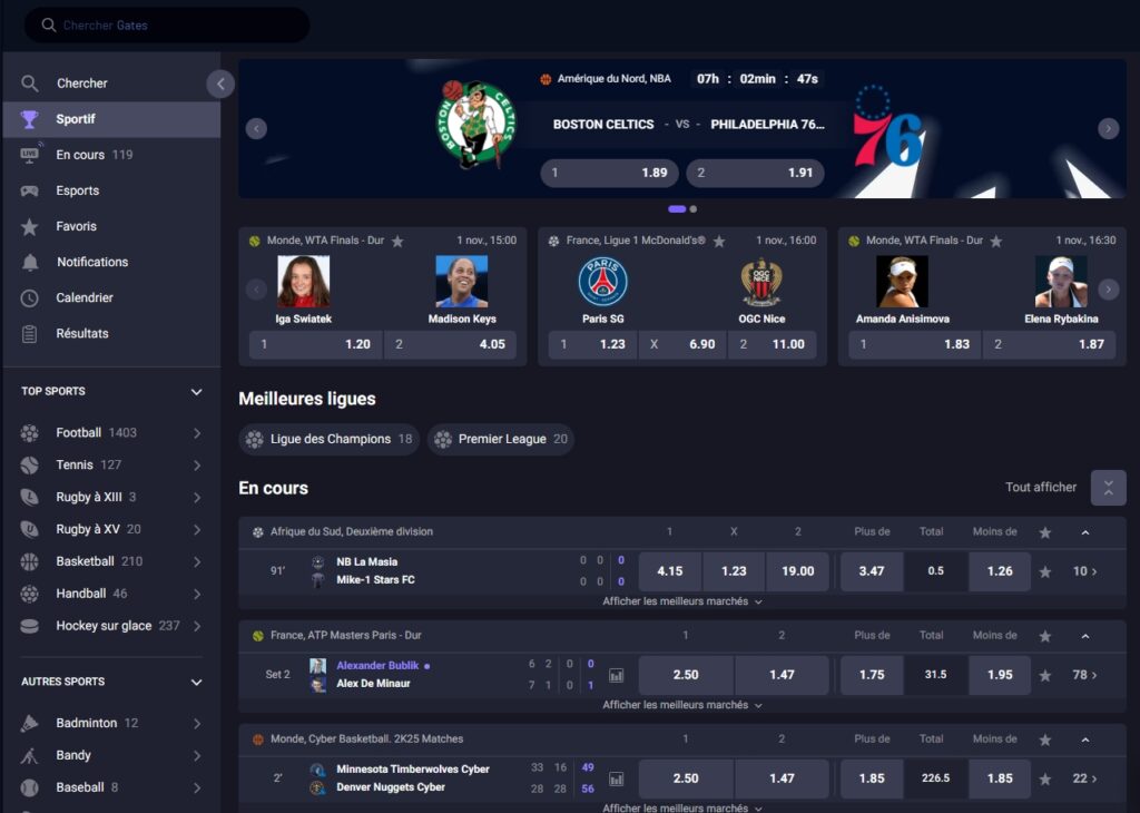 - ⚽ Multiples sports disponibles en pré-match ou direct