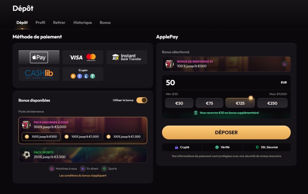 - 🎁 Premier dépôt : bonus 100 % jusqu’à 500 €