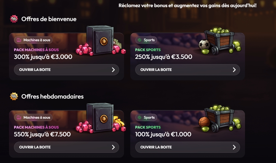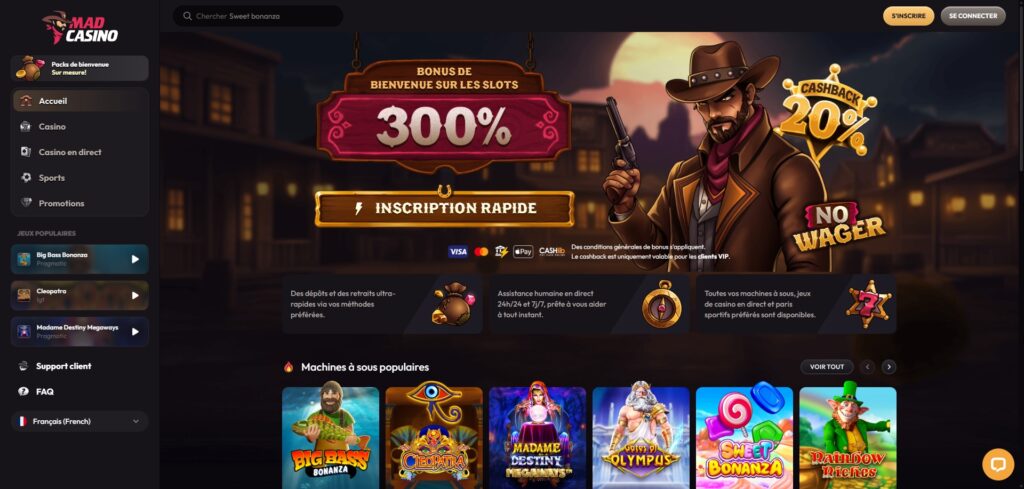 Le site séduit dès l’arrivée avec un pack d’accueil généreux réparti sur les trois premiers dépôts. Mad casino affiche clairement sa volonté d’attirer les nouveaux inscrits avec des bonus de bienvenue conséquents et propose aussi des promotions récurrentes tout au long de la semaine.